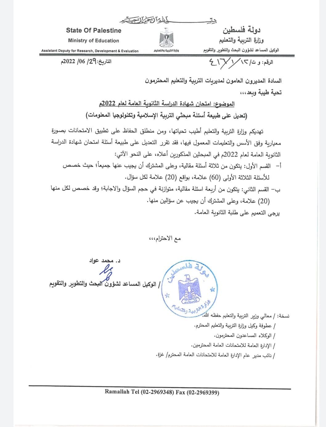 وزارة التربية والتعليم تنشر تنويهًا حول تعديل طبيعة أسئلة مبحثي التربية الإسلامية وتكنولوجيا المعلومات، الأربعاء 29.06.2022.