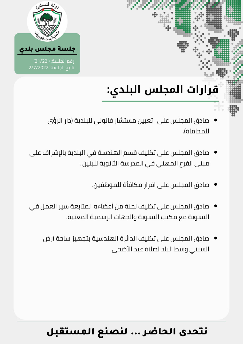 مجلس بلدي بيت فوريك يعقد جلسته الأسبوعية، السبت 02.07.2022، ويتخذ عدة قرارات.