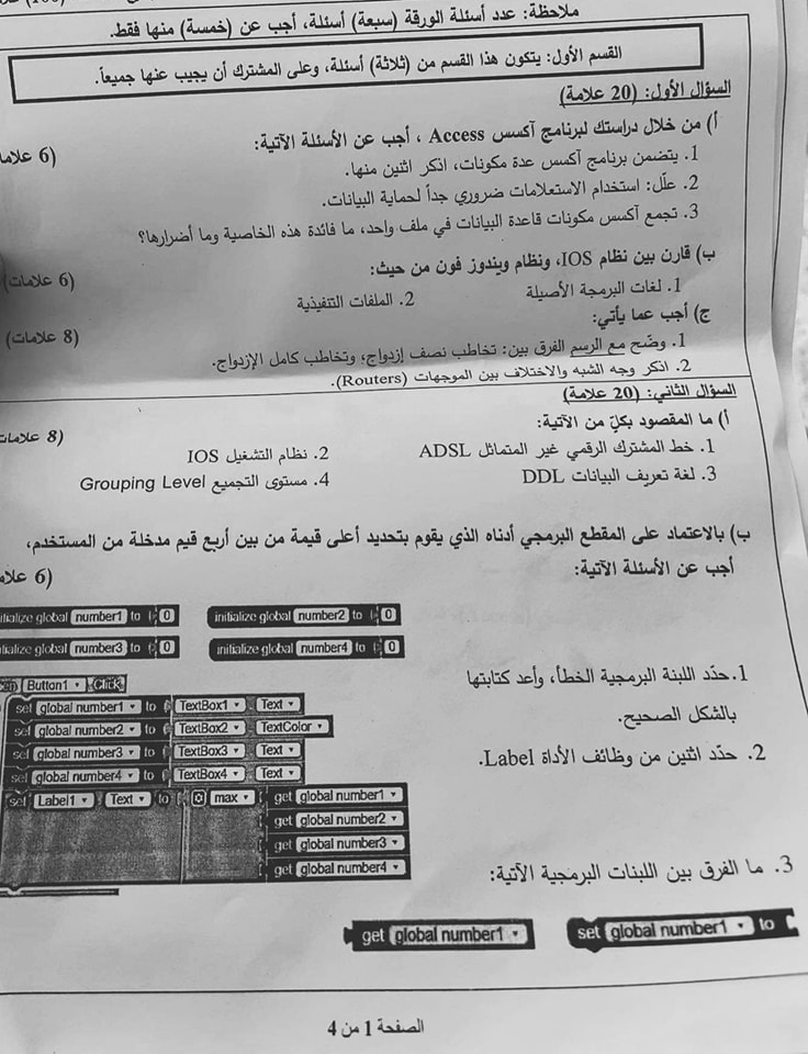 أسئلة امتحان الثانوية العامة لمادة تكنولوجيا المعلومات للفرع العلمي والصناعي، الاثنين 04.07.2022.