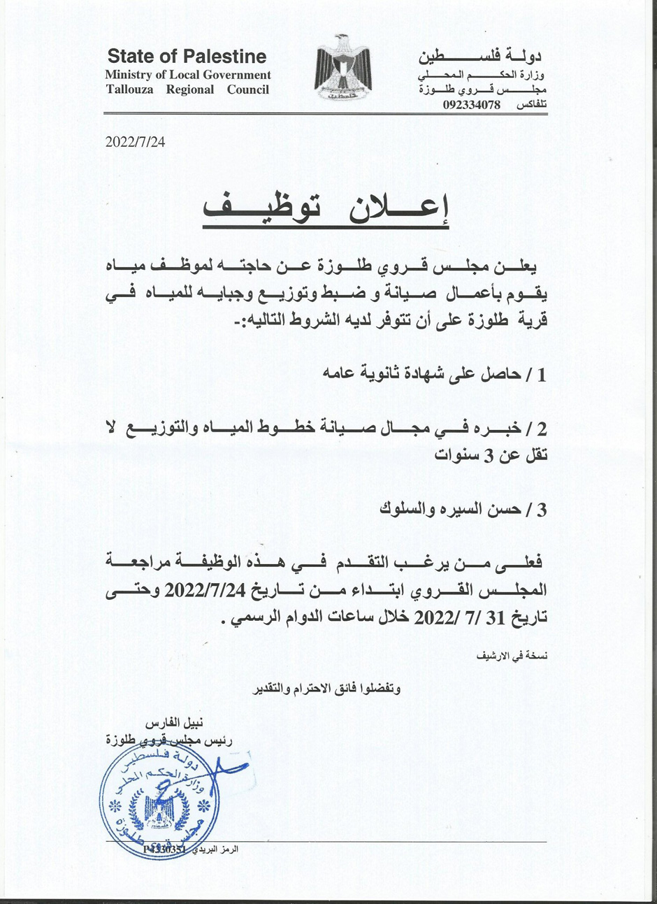 طلوزة: مطلوب موظف مياه