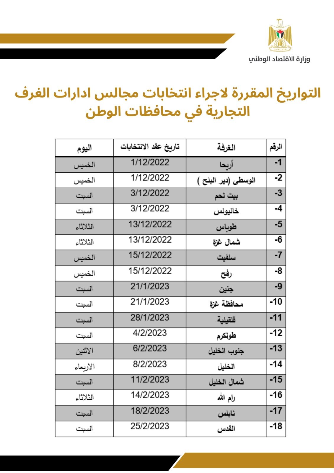 الجدول الزمني لإجراء العملية الانتخابية لمجالس إدارات الغرف التجارية الصناعية في محافظات الوطن.