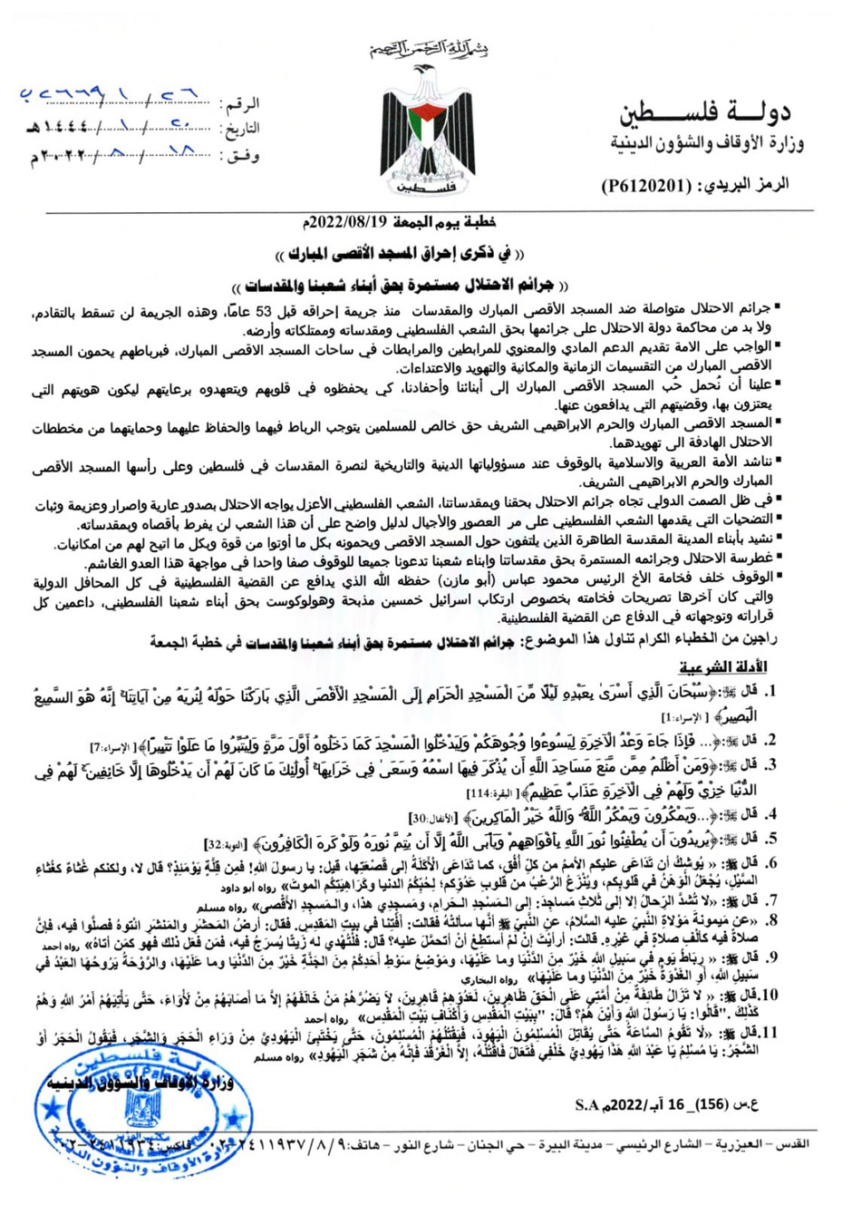 وزارة الأوقاف تحدد موضوع خطبة الجمعة 19.08.2022.