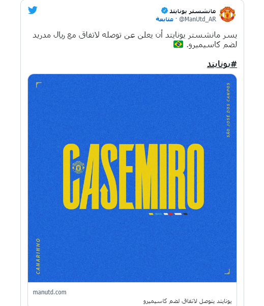 أعلن نادي مانشستر يونايتد الإنجليزي لكرة القدم، الجمعة 19.08.2022، رسميا توصله لاتفاق مع نظيره ريال مدريد الإسباني، بشأن التعاقد مع لاعب خط الوسط البرازيلي كاسيميرو.