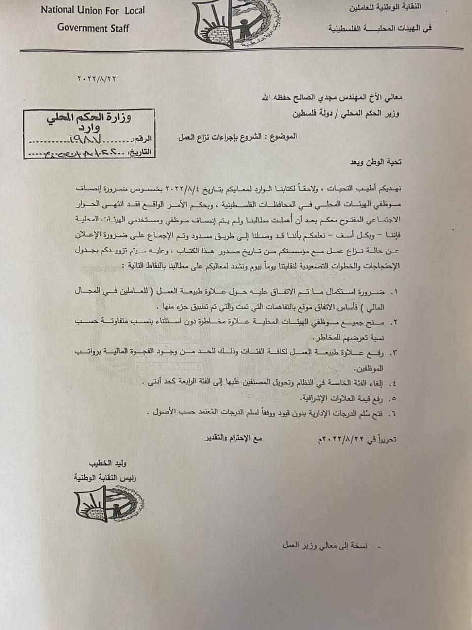 نقابة العاملين في الهيئات المحلية ترسل كتاباً لوزير الحكم المحلي، الاثنين 22.08.2022، بخصوص الشروع بإجراءات نزاع العمل.