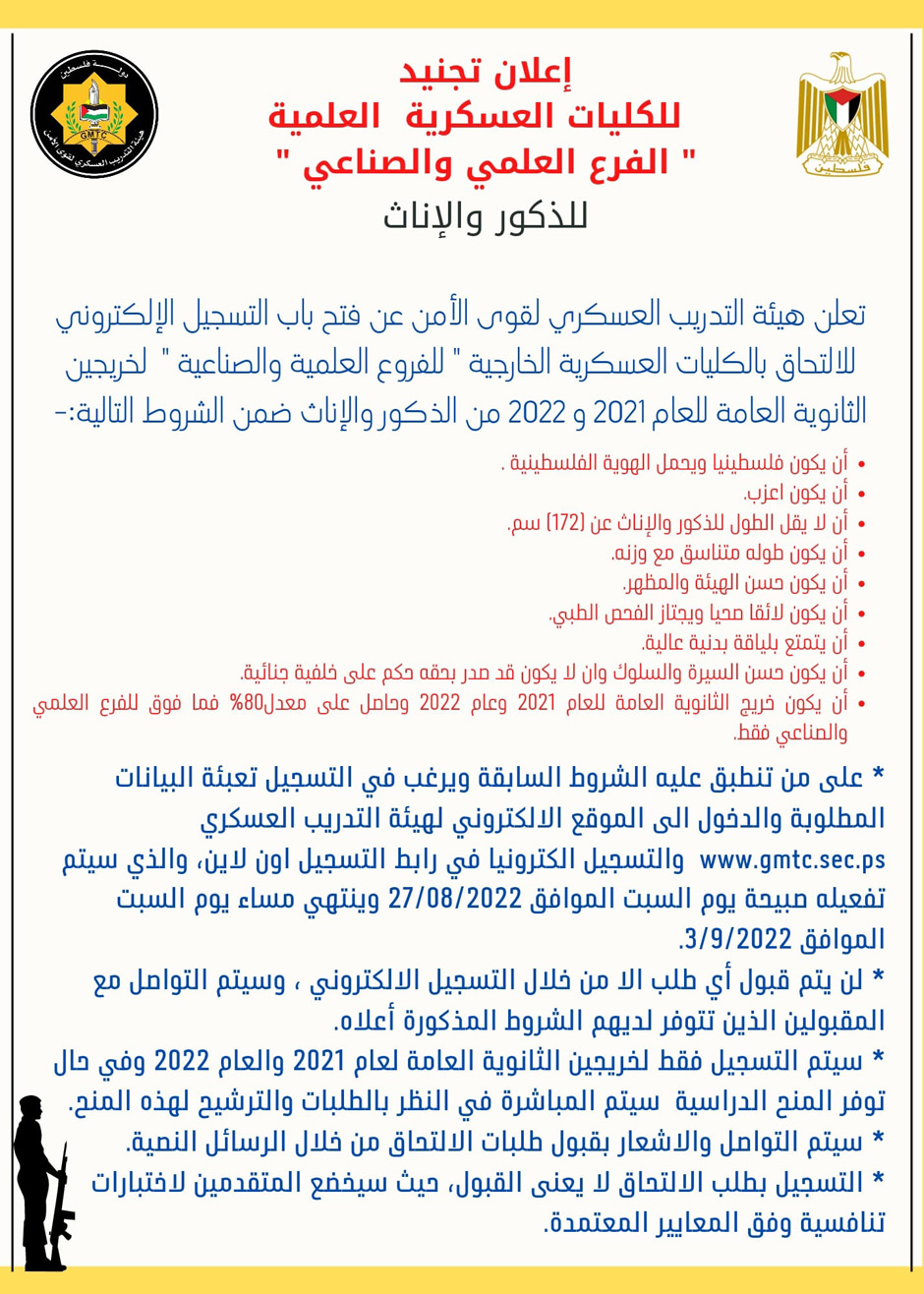 أعلنت هيئة التدريب العسكري لقوى الأمن، السبت 27.08.2022، عن فتح باب التسجيل الإلكتروني للالتحاق بالكليات العسكرية الخارجية، للفروع العلمية والصناعية.