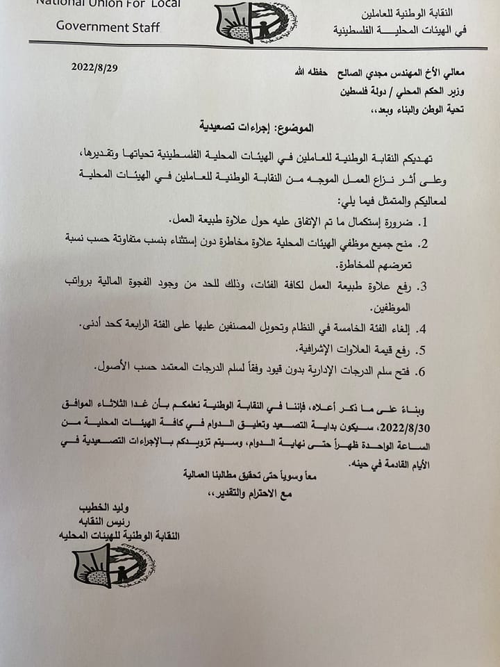 النقابة الوطنية للعاملين في الهيئات المحلية تعلن عن خطوات تصعيدية مع وزارة الحكم المحلي، وتبدأ بتعليق الدوام في الهيئات المحلية في تمام الساعة الواحدة، الثلاثاء 30.08.2022.