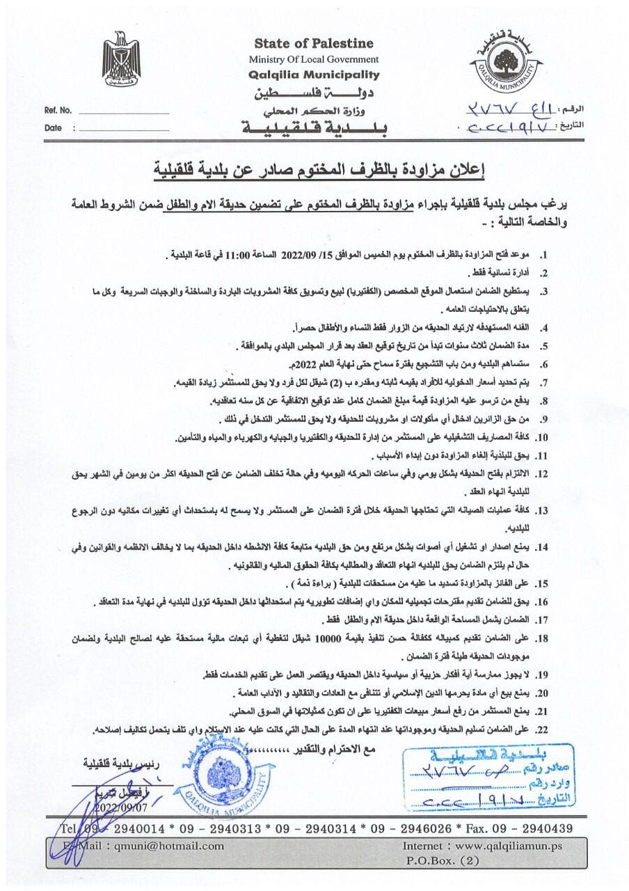 مجلس بلدي قلقيلية يعلن عن مزاودة بالظرف المختوم لتضمين حديقة الأم والطفل.