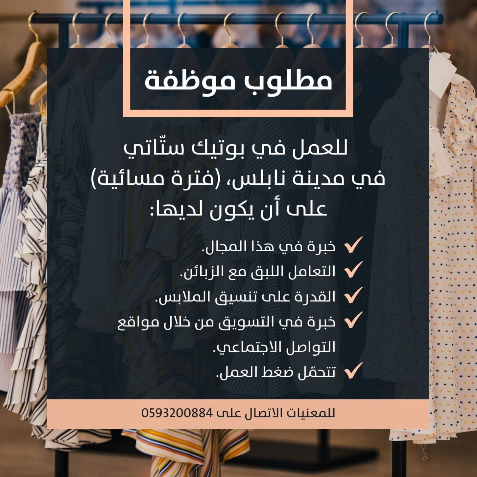 بوتيك ستاتي في مدينة نابلس يعلن عن حاجته إلى موظفة للعمل في الفترة المسائية.