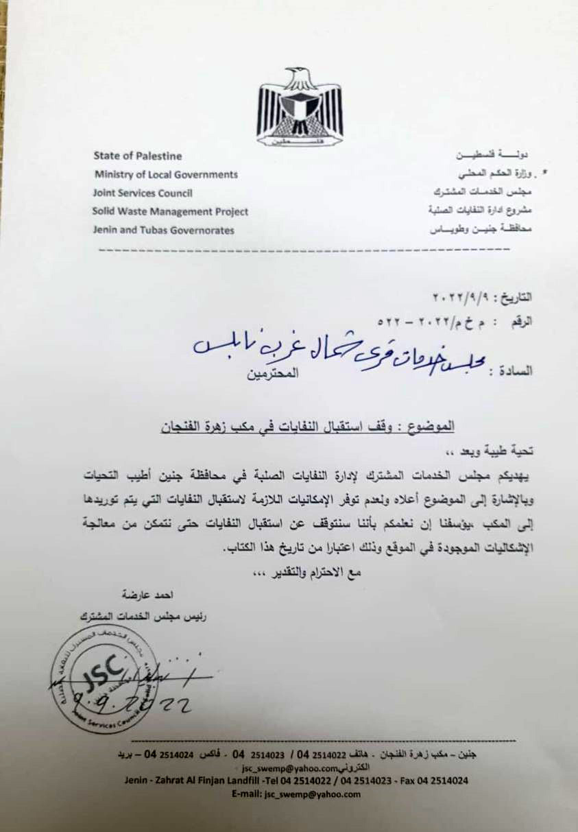 مجلس الخدمات المشترك لإدارة النفايات الصلبة في محافظة جنين يبلغ الهيئات المحلية في مجلس خدمات قرى شمال غرب نابلس بعدم إرسال نفاياتها إلى مكب زهرة الفنجان في جنين إلى أجل غير مسمى.