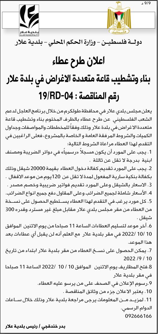 نشرت بلدية علار السبت 2022.9.10، إعلانا لطرح عطاء بناء وتشطيب قاعة متعددة الأغراض في بلدة علار،