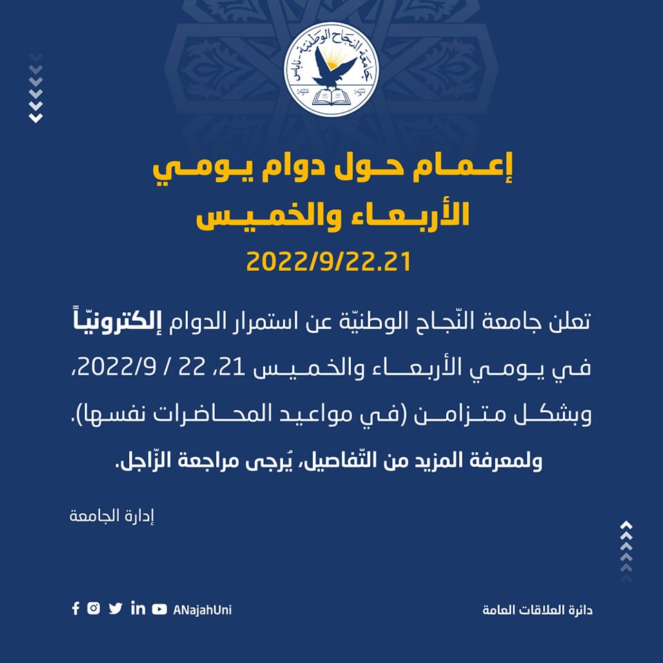 جامعة النجاح تعلن عن استمرار الدوام إلكترونياً يومي الأربعاء والخميس.