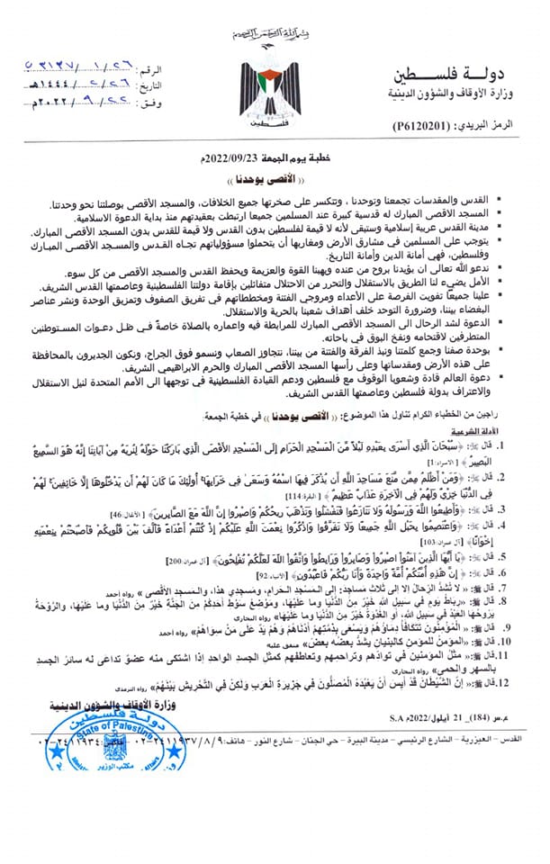 وزارة الأوقاف تعلن عن موضوع خطبة الجمعة 23.09.2022.