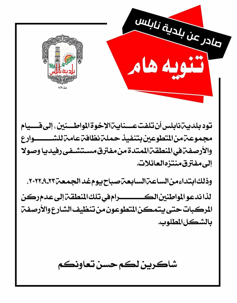 بلدية نابلس تدعو المواطنين إلى عدم ركن مركباتهم في الشوارع من مستشفى رفيديا وصولاً إلى منتزه العائلات، الجمعة 23.09.2022.