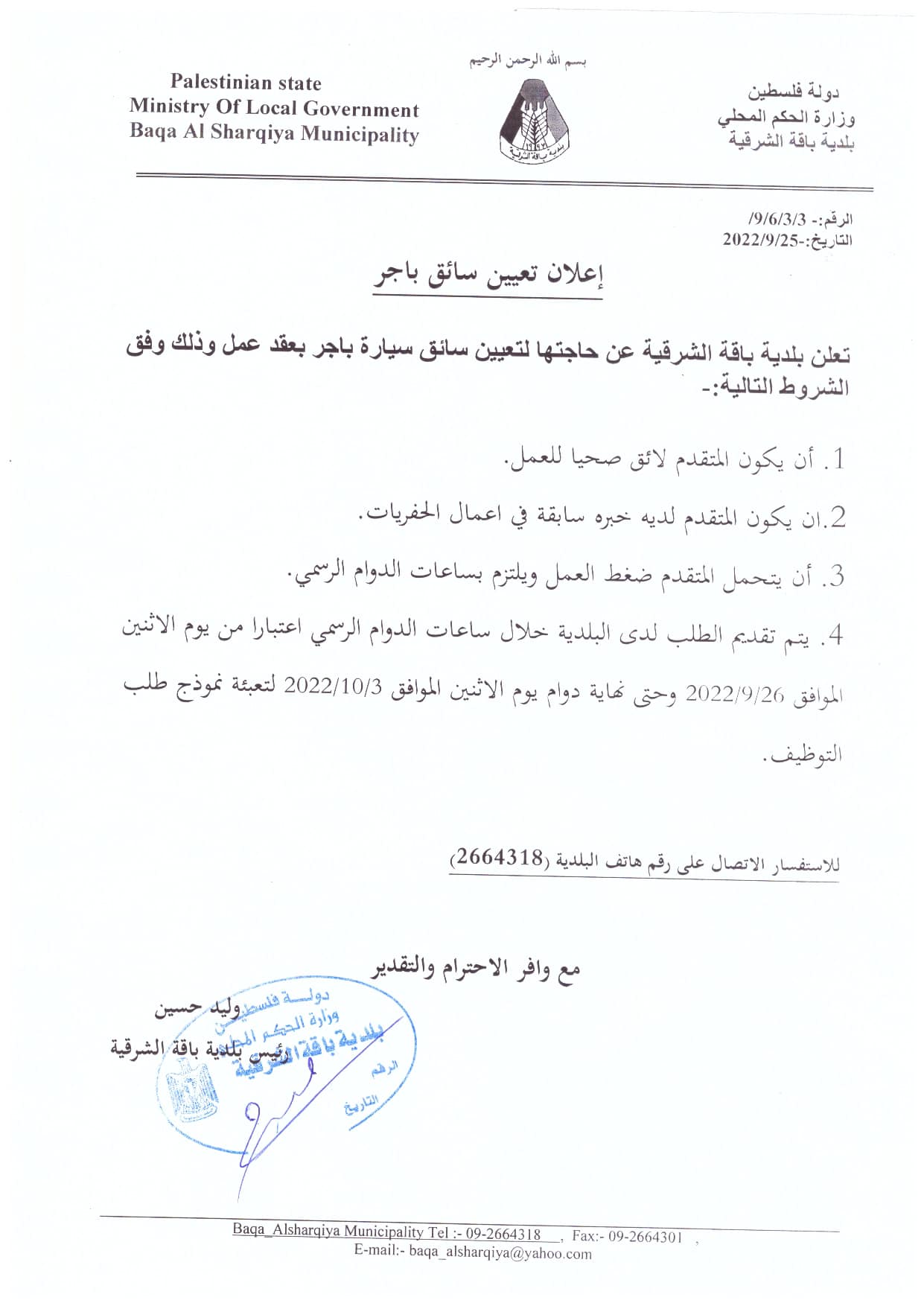 بلدية باقة الشرقية: مطلوب سائق باجر