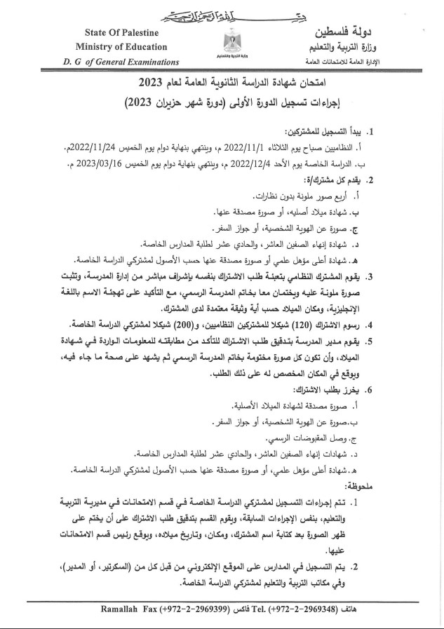 نشرت مديرية التربية والتعليم - جنوب نابلس، الاثنين 03.10.2022، تعميما من قسم الامتحانات بشأن التسجيل لامتحان شهادة الدراسة الثانوية العامة الدورة الأولى.