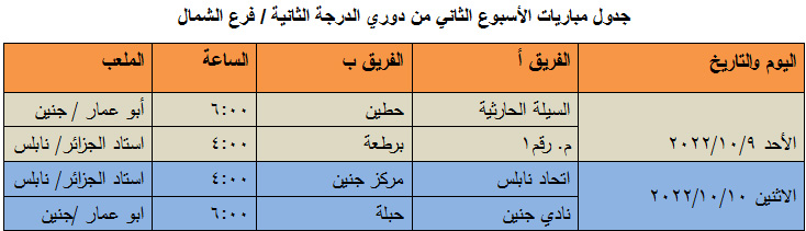 الاتحاد الفلسطيني لكرة القدم - فرع الشمال ينشر جدول مباريات الأسبوع الثاني من دوري الدرجة الثانية.