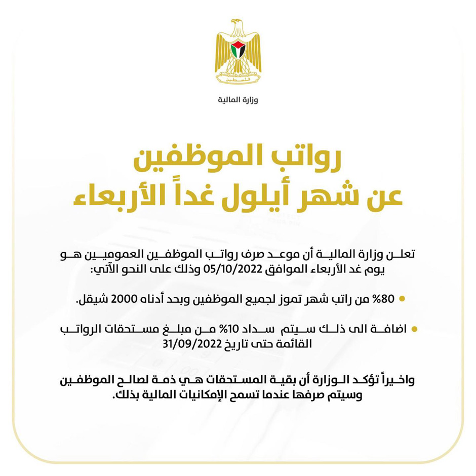 وزارة المالية تعلن عن أن صرف رواتب الموظفين العموميين لشهر أيلول، بنسبة 80%، يوم الأربعاء 05.10.2022.