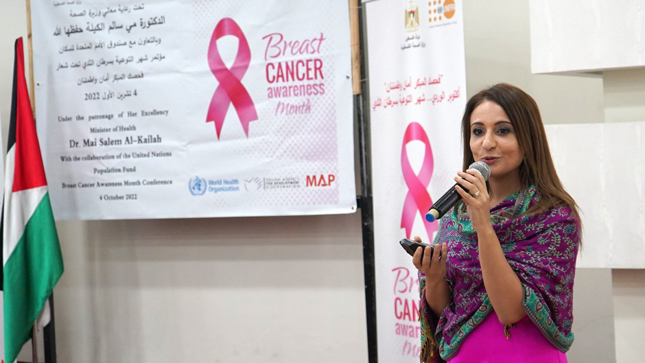 جاء ذلك خلال مؤتمر شهر التوعية بسرطان الثدي الذي عقد في رام الله، الأربعاء 05.10.2022، برعاية وحضور الوزيرة الكيلة وبالتعاون مع صندوق الأمم المتحدة للسكان.