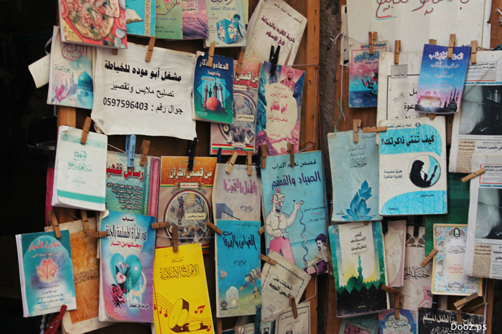 تغطي المجلات القديمة والكتيبات باب دكان بائع الجرائد بالكيلو في البلدة القديمة بنابلس[/caption]