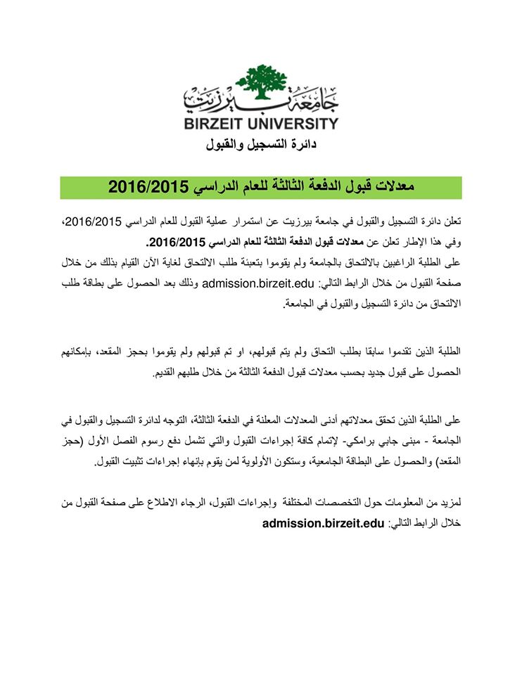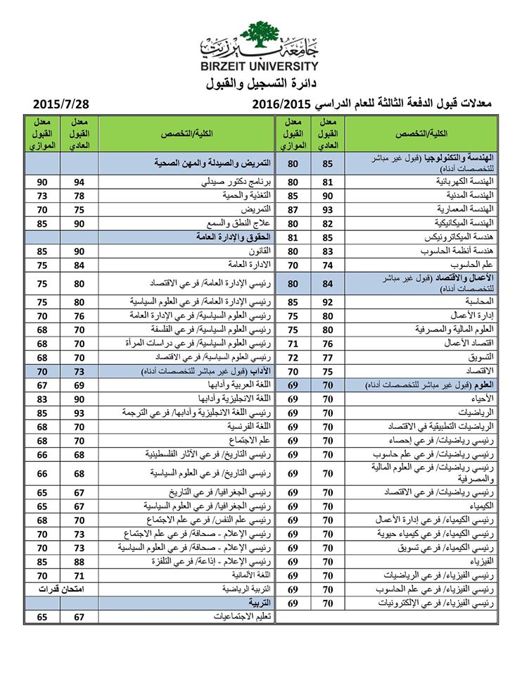 دائرة القبول والتسجيل في جامعة بيرزيت تعلن عن معدلات قبول الدفعة الثالثة للعام الدراسي 2015-2016.
