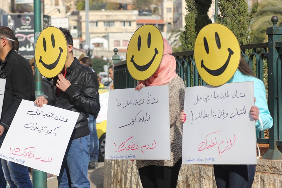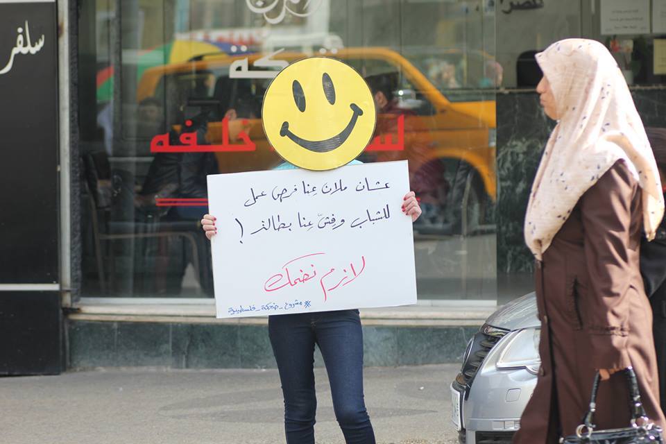 من العبارات التي رفعها الشباب المشاركون "عشان عنا حكومتين ..لازم تضحك" و "عشان العمر بيخلص والمفاوضات ما بتخلص ..لازم نضحك"[/caption]