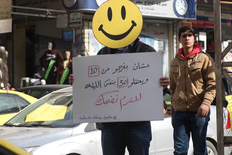 - شارك في المبادرة أكثر من 50 شاب وشابة من مدينة نابلس ورام الله حاملين لافتات تعبر عن الواقع الفلسطيني بعبارات ساخرة وبأسلوب محدث للتعبير عن هموم الشعب.