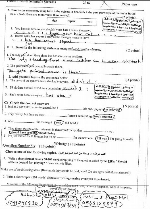 إجابات امتحان الإنجليزي (علمي وأدبي) توجيهي