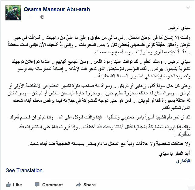 ووصف أبو عرب مستشاري الرئيس بـ "المضللين" في حال أشاروا على الرئيس بالمشاركة، وكتب: "وإنك إذا قررت المشاركة بالجنازة لقاتل أبنائنا وحدك فقد أخطأت .. وإذا قررت بناءً على استشارات فقد ضلّلوك".
