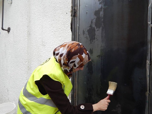 وبعد تركيب باب للبقالة الجديدة شاركت فتيات بصمة في طلائه، في عمل يعتبر لدى كثيرين مقتصرا على الرجال.[/caption]