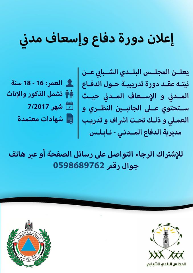المجلس البلدي الشبابي في نابلس يعلن عن عقد دورة دفاع وإسعاف مدني.