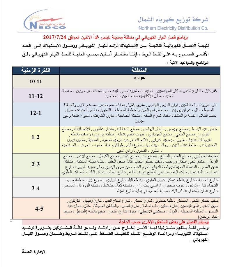 جدول قطع الكهرباء في نابلس وضواحياه ليوم الاثنين 24.07.2017.