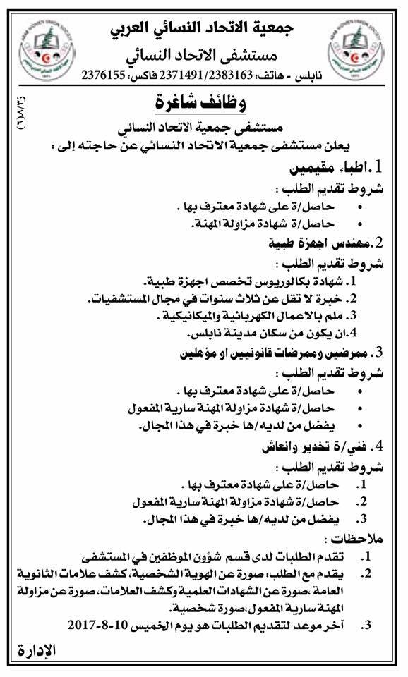 وظائف شاغرة في مستشفى الاتحاد بنابلس