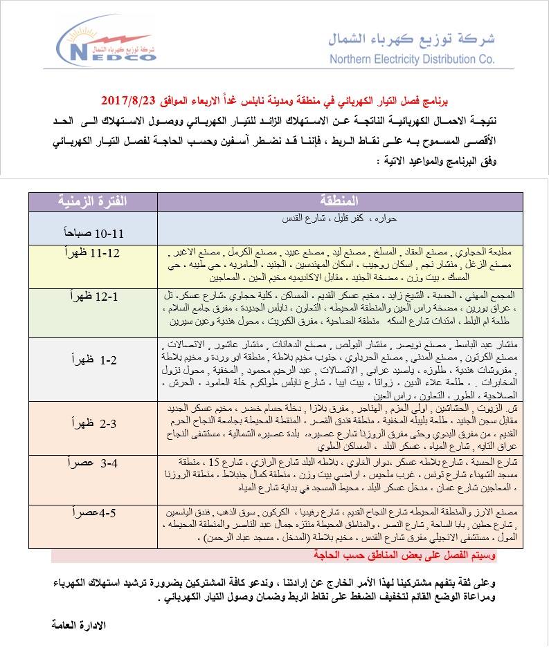 فصل الكهرباء في نابلس الأربعاء 23.08.2017.