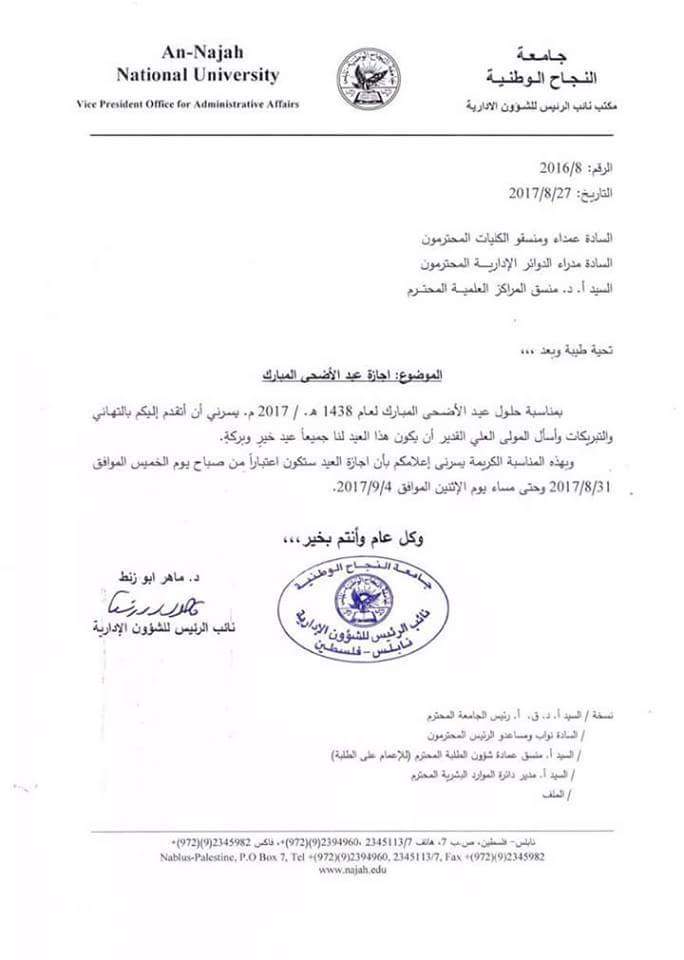 جامعة النجاح تحدد عطلة عيد الأضحى 2017.