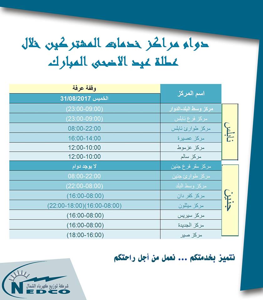 شركة كهرباء الشمال تنشر جدولاً بمواعيد دوام مراكز خدماتها في جنين ونابلس خلال أيام عيد الأاضحى 2017.