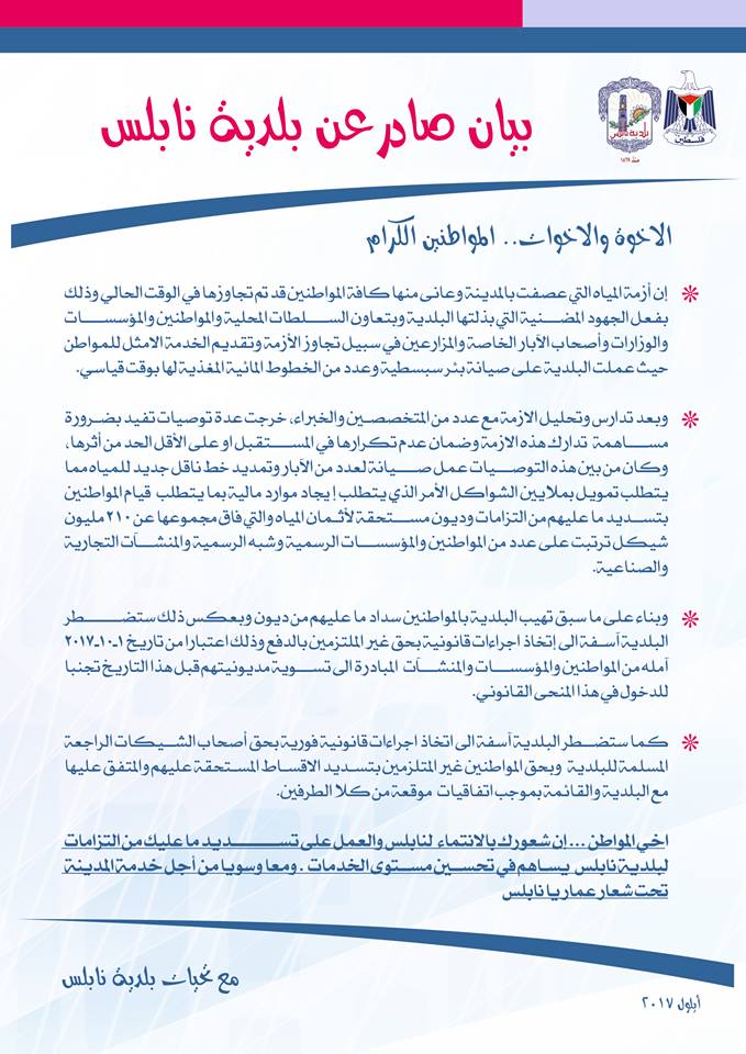 بلدية نابلس تؤكد أنها ستضطر إلى اتخاذ إجراءات قانونية ابتداءً من 01.10.2017 بحق المتخلفين عن سداد ديون المياه.