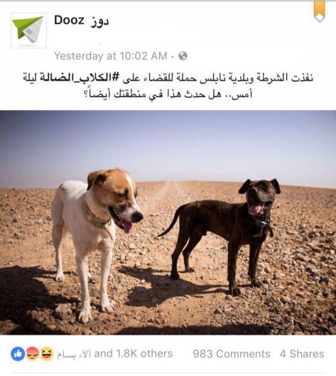 عقب إعلان الشرطة البدء بحملة للقضاء على الكلاب الضّالّة في نابلس، مساء الخميس 05.10.2017، نشر دوز للصحافة والإعلام على صفحته في الفيسبوك منشوراً تفاعليّاً يسأل المواطنين إن كانت الحملة قد شملت مناطق سكنهم أيضاً.