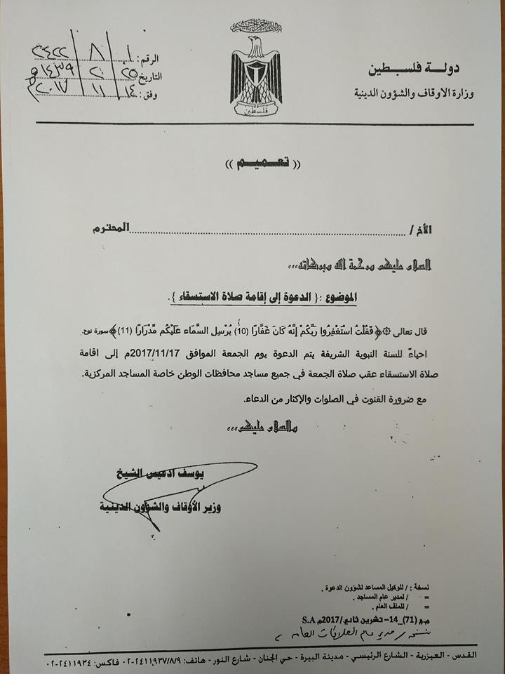 دعا وزير الأوقاف والشؤون الدينية الشيخ يوسف ادعيس، الثلاثاء 14.11.2017، خطباء المساجد في فلسطين لصلاة الاستسقاء يوم الجمعة القادم عقب صلاة الجمعة اقتداء بسنة النبي.