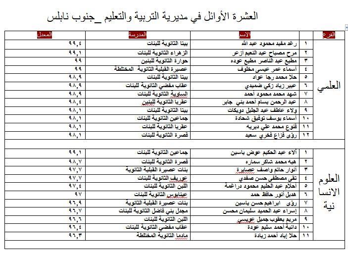 على الطلبة الواردة أسماؤهم في الجدول المرفق حضور الحفل الذي ستقيمه محافظة نابلس يوم الثلاثاء 21.11.2017، الساعة الثانية عشرة ظهراً في قاعة الشهيدة لينا النابلسي في مبنى المحافظة، لاستلام مكرمة الرئيس للطلبة الأوائل من مديرية التربية والتعليم في نابلس.