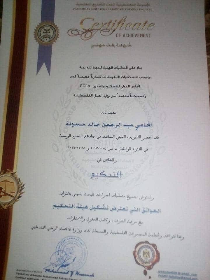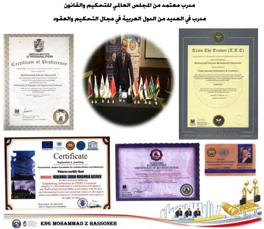 الإشراف العلمي: المستشار المحكم المهندس محمد زهران حسونة مدرب مدربين معتمد من المجلس العالمي للتحكيم والقانونGCLAIP. مدرب وهضو الهيئة العربية للتحكيم - اتحاد المهندسين العرب. ممثل المجموعة الامريكية لاعتماد المشاريع التعليمية AGMEP. محكم معتمد لدى وزارة العدل الفلسطينية. عضو غرفة التحكيم الفلسطينية الدولية PIAC.