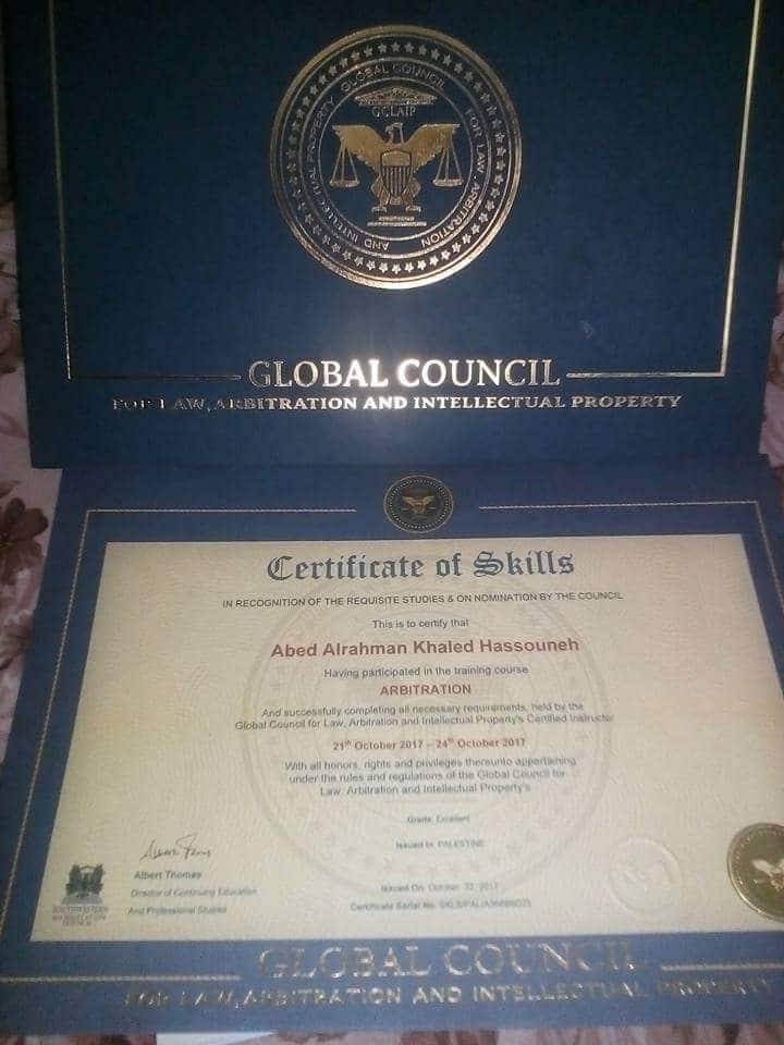 3. إمكانية الحصول على شهادة دولية من المجلس العالمي للتحكيم والقانون GCLA في واشنطن أو المعهد الأمريكي للدراسات الاحترافية AIPS بالترتيب مع مدرب الدورة.