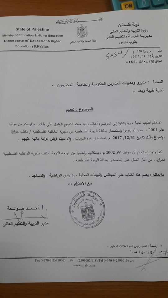 تعميم من مديرية التربية والتعليم - جنوب نابلس، يؤكد على ضرورة قيام طلاب المدارس من مواليد عام 2001 بإصدار بطاقة الهوية.