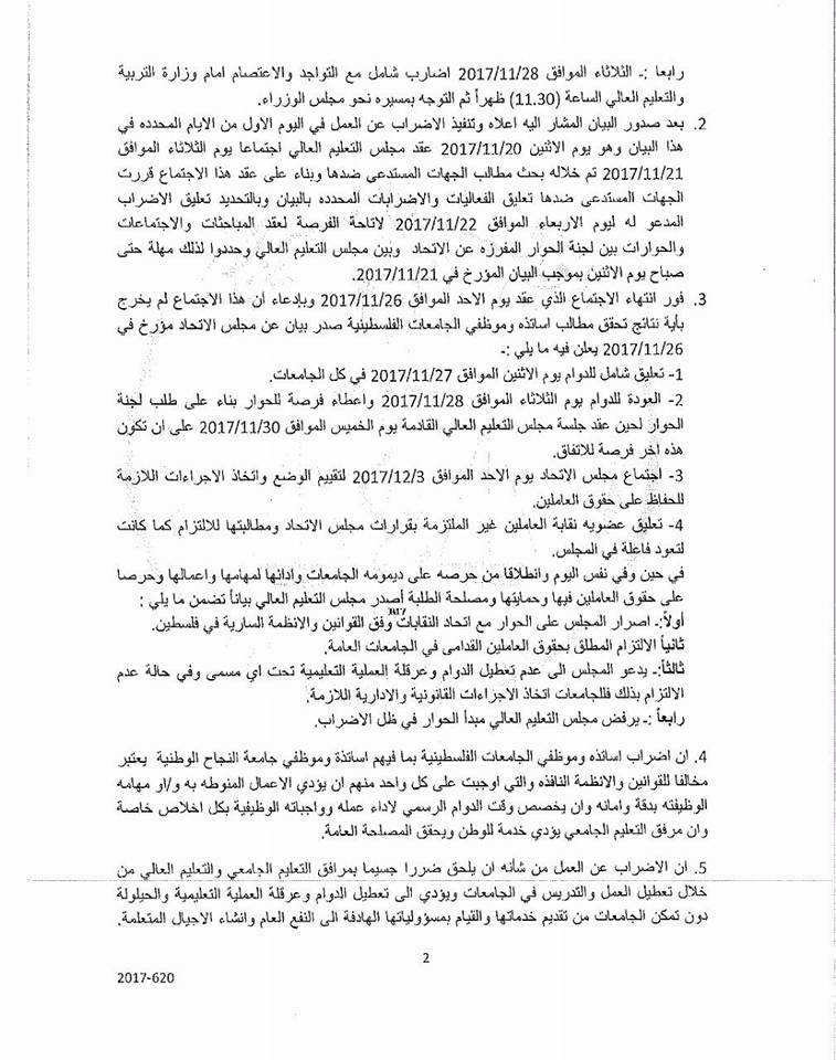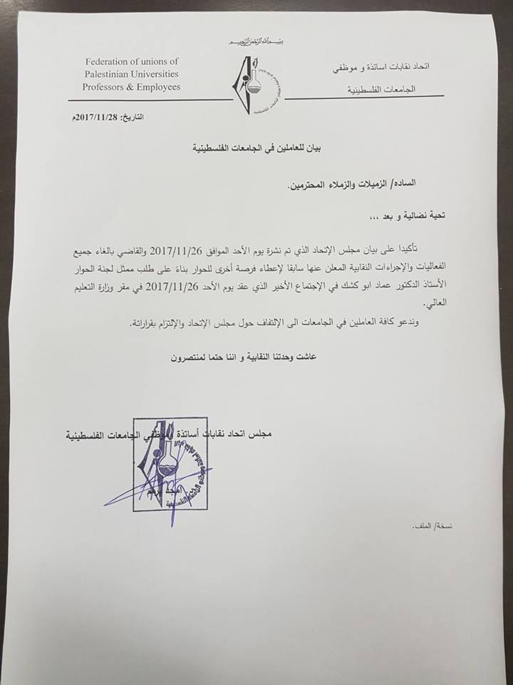 وأكد بيان لاحق لاتحاد نقابات العاملين في الجامعات الفلسطينية، على تعليق كافة الفعاليات والإجراءات المعلن عنها سابقاً "بهدف إعطاء فرصة أخرى للحوار بناء على طلب ممثل لجنة الحوار عماد أبو كشك". ومن جهتها، أكدت نقابة العاملين في جامعة النجاح على التزامها بما جاء في بيان الاتحاد، مما يعني انتظام الدوام في الجامعة يوم الأربعاء 29.11.2017.