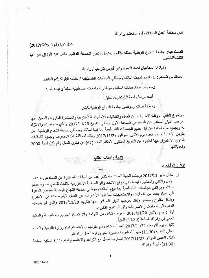 "تقدمت ادارة جامعة النجاح ممثلة بالقائم بأعمال رئيس الجامعة الدكتور ماهر النتشة برفع دعوى قضائية ضد اتحاد نقابات الجامعات الفلسطينية وضد الهيئة الإدارية لنقابة جامعة النجاح الوطنية لدى محكمة العدل العليا في رام الله، حيث سيمثل اتحاد النقابات غداً أمام المحكمة، اننا واذ ننظر لهذه الخطوة بعين الاستهجان والخطورة والقلق على مستقبل موظفي الجامعات والعمل النقابي فإننا نؤكد على ما يلي: