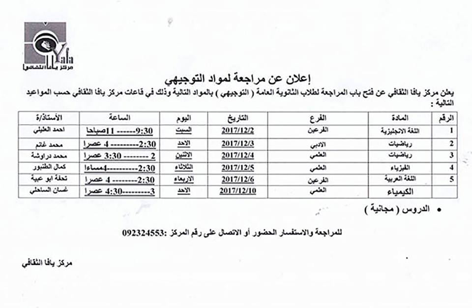 مركز يافا الثقافي يعلن لطلبة الثانوية العامة (الأدبي والعلمي) عن مواعيد دروس المراجعة لعدد من المواد الأساسية خلال شهر كانون أول (12) القادم وفقاً للبرنامج التالي، علماً أن الدروس مجانية.