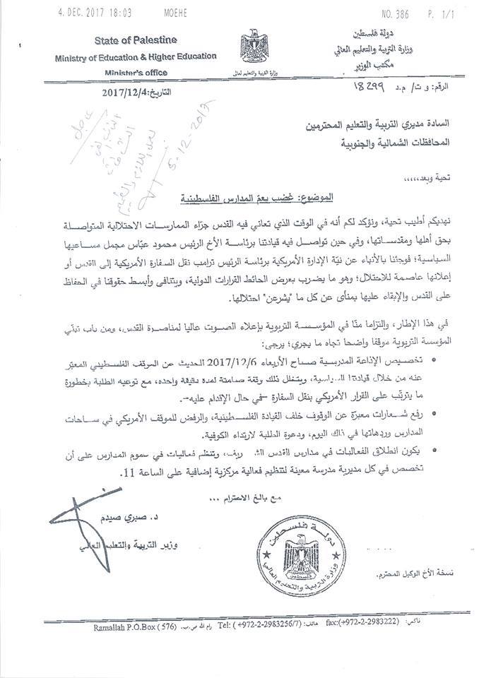 في ضوء إعلان الرئيس الأمريكي دونالد ترامب نقل السفارة الأمريكية إلى القدس، التربية والتعليم تصدر مجموعة من التعليمات والفعاليات التي يجب العمل بها في المدارس لمناصرة القدس.