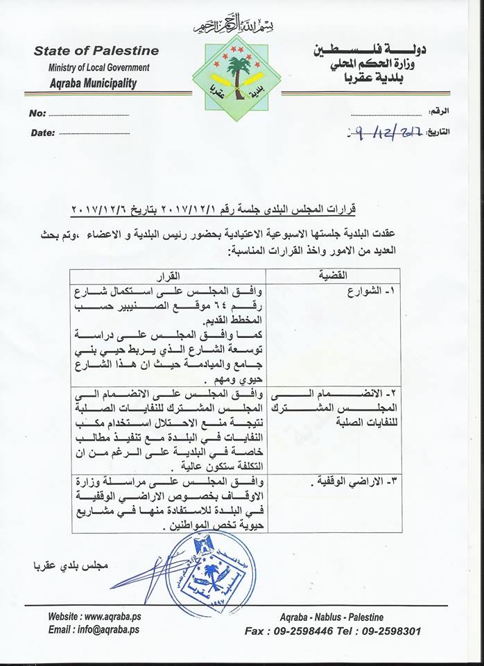 ووافق المجلس على مراسلة وزارة الأوقاف بخصوص الأراضي الوقفية في عقربا "للاستفادة منها في مشاريع حيوية تخص المواطنين".