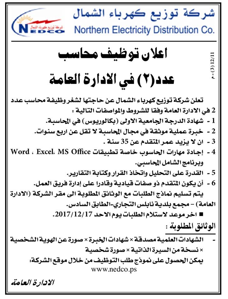 وظيفة شاغرة في مجال المحاسبة بنابلس