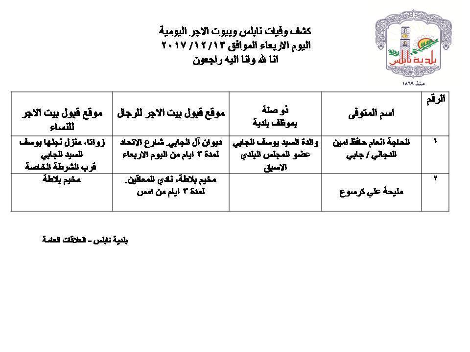 وفيات مدينة نابلس ليوم الأربعاء 13.12.2017 وأماكن بيوت العزاء.