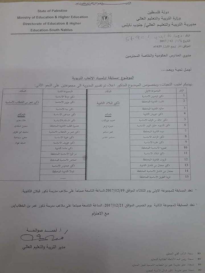 مديرية التربية والتعليم - جنوب نابلس تعلن عن تقسيم مدارس المديرية إلى مجموعتين في مسابقة أولمبياد الألعاب التربوية.
